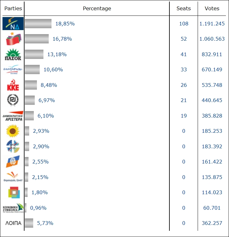 Grecia: risultati definitivi. Democristiani + Socialisti= 149 Seggi. Maggioranza richiesta=151 Seggi