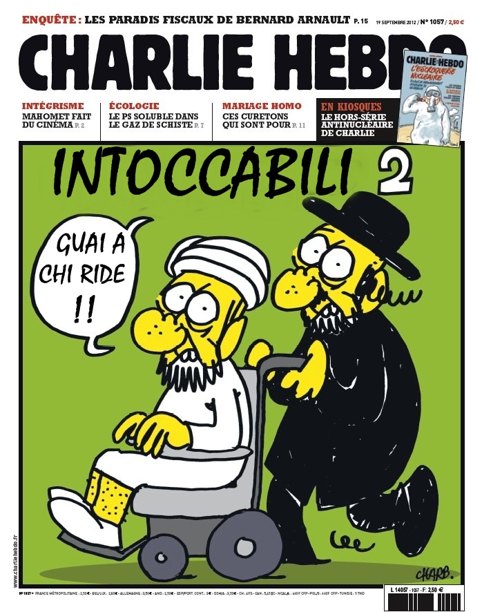 Per l’eccessivo numero di visitatori l’accesso al sito internet della rivista è bloccato dalle prime ore di questa mattina. Una delle immagini incriminate, pubblicate in quarta di copertina, mostra un rabbino che spinge un imam in sedia a rotelle ed è intitolata “Intoccabili 2: guai a chi ride!”. La tradizionale rubrica del giornale “Le copertine che vi siete persi” mostra, inoltre, alcuni disegni di Maometto nudo. Il Consiglio francese per il culto musulmano si è detto “profondamente scioccato” per la pubblicazione di questi disegni e ha invitato “tutti i musulmani in Francia a non cedere alla provocazione”. Il direttore della pubblicazione di Charlie Hebdo, il disegnatore che si firma Charb, ieri ha ammesso ai microfoni di Rtl che le nuove caricature potevano suscitare polemiche. Ma il giornalista si è giustificato spiegando che “se iniziamo a porci la domanda se abbiamo o meno il diritto di disegnare Maometto, se sia pericoloso o meno farlo, la domanda successiva sarà, possiamo rappresentare dei musulmani nel giornale? E poi sarà se possiamo rappresentare degli esseri umani nel giornale, e alla fine non rappresenteremo più nulla e il gruppo di estremisti che si agitano nel mondo e in Francia avrà vinto”.