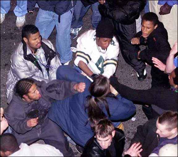 E che dire di quest’altro assalto bestiale, nel quale un branco di “afroamericani” aggredisce e massacra un ragazzo perché aveva “invaso il loro territorio”?