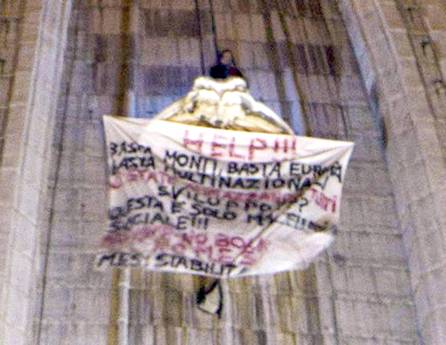 Un uomo si è arrampicato sulla cupola di San Pietro a Roma, esponendo uno striscione in cui si legge “Basta Monti, basta Europa, basta multinazionali“. L’uomo era appoggiato sulla finestra del cupolone. Sul posto è intervenuta la gendarmeria vaticana.