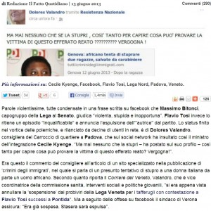 Noi evidenziamo la sproporzione nella reazione rispetto ad un intervento inappropriato. Si guarda al dito – il commento – e si dimentica la luna – lo stupro. Le coincidenze esistono, del resto la congolese è sempre in giro a parlare delle stesse cose.